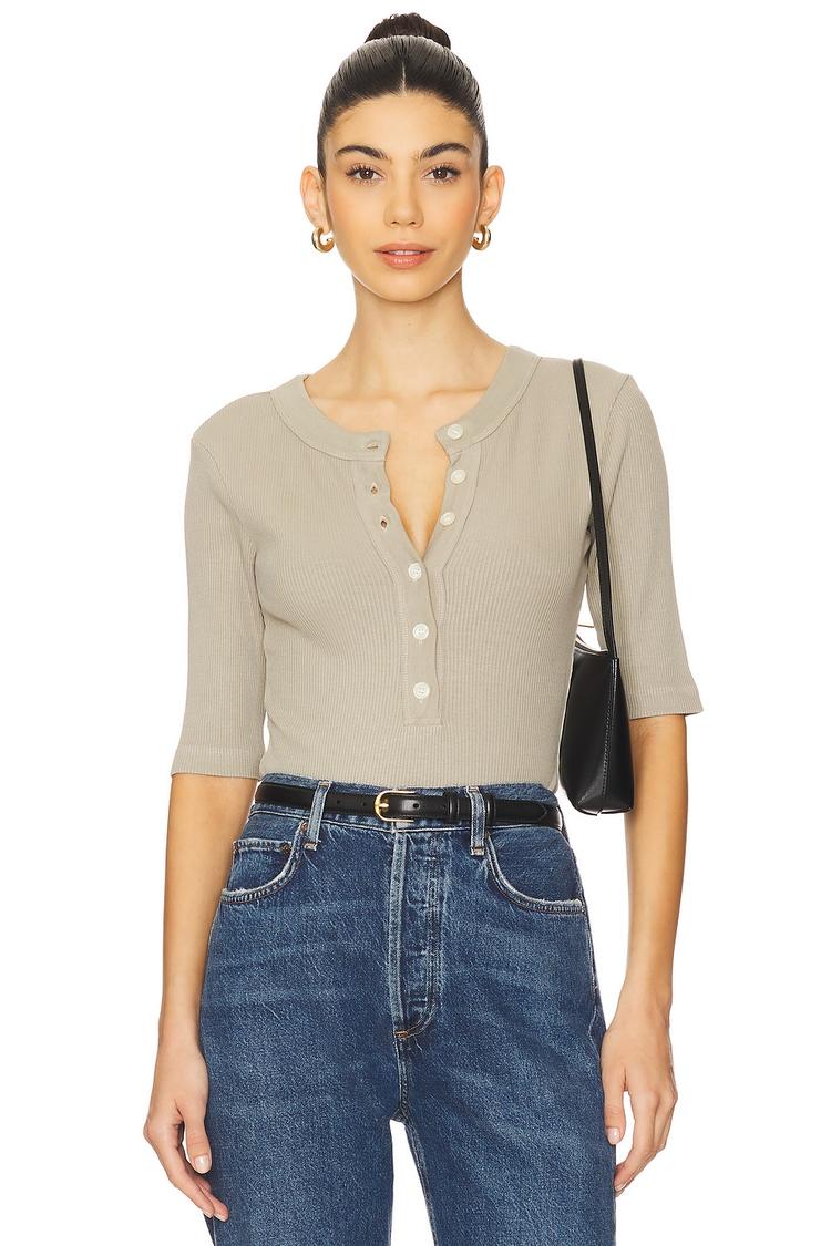 Soft ribbed jersey fabric and a fitted silhouette define this Henley tee, crafted from an eco-friendly cotton and lyocell blend with a touch of spandex for stretch. Featuring a classic henley neckline with a front partial button closure and elbow-length sleeves, this hip-length top offers versatile styling for casual outings, everyday wear, or laid-back work environments. Its minimalist beige hue and clean lines create a timeless, casual chic look that pairs effortlessly with denim or skirts for brunch dates or relaxed office days.