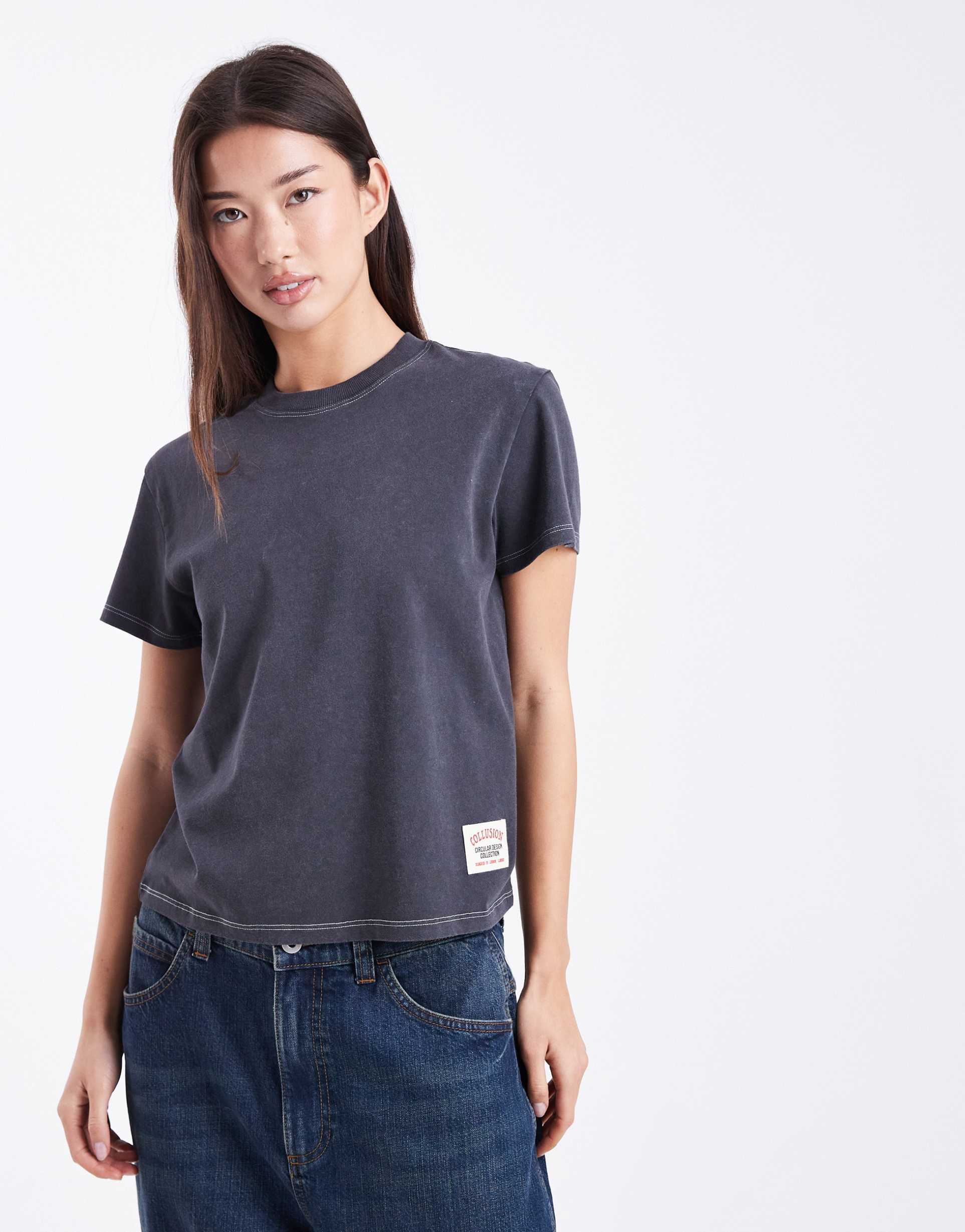 COLLUSION CIRCULAR DESIGN COLLECTION FITTED SHRUNKEN T-SHIRT IN WASHED BLACK
