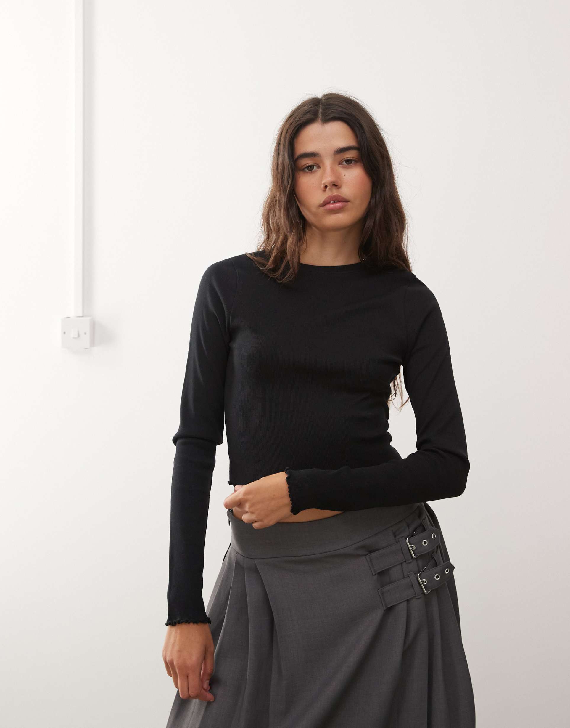 Soft cotton blend fabric and a slim fit define this cropped t-shirt with a classic crew neck and long sleeves. The subtle lettuce-edge ruffle trim on the hem and cuffs adds a delicate touch to its minimalist black design. Ideal for layering or wearing solo, this versatile piece suits casual outings, everyday wear, and street style looks across cooler seasons like autumn and spring. Its comfortable stretch fabric ensures ease of movement while maintaining a flattering silhouette.