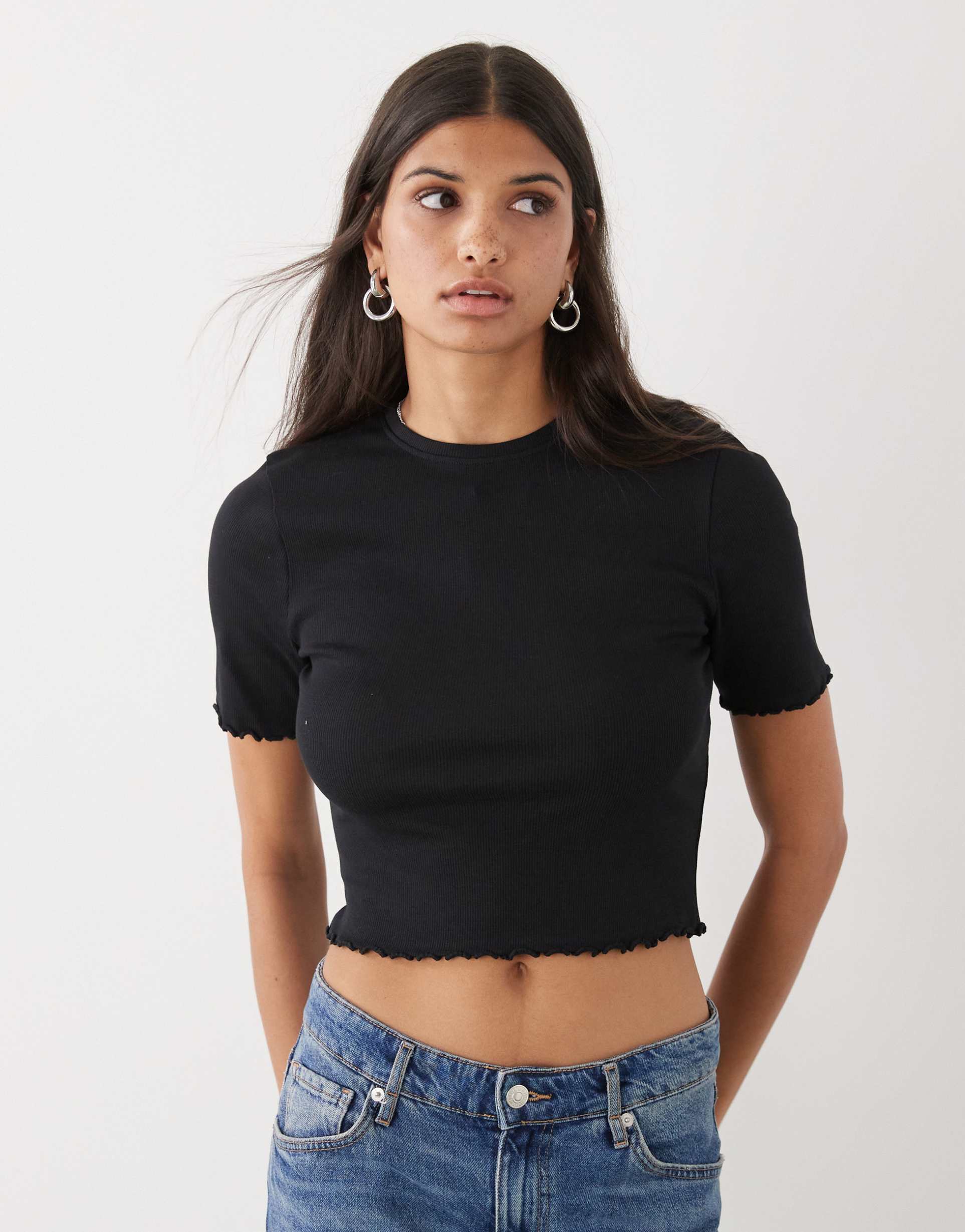 Soft ribbed cotton with a hint of stretch shapes this cropped tee featuring a classic crew neck and half sleeves. The slim fit silhouette is accented by delicate lettuce-edge ruffles on the hem and sleeve cuffs, adding a subtle feminine touch. Its versatile black shade and casual chic style make it ideal for everyday wear, streetwear looks, or relaxed weekend outings. Comfortable and stylish, this top pairs effortlessly with high-waisted jeans or skirts for a modern, minimalist vibe.