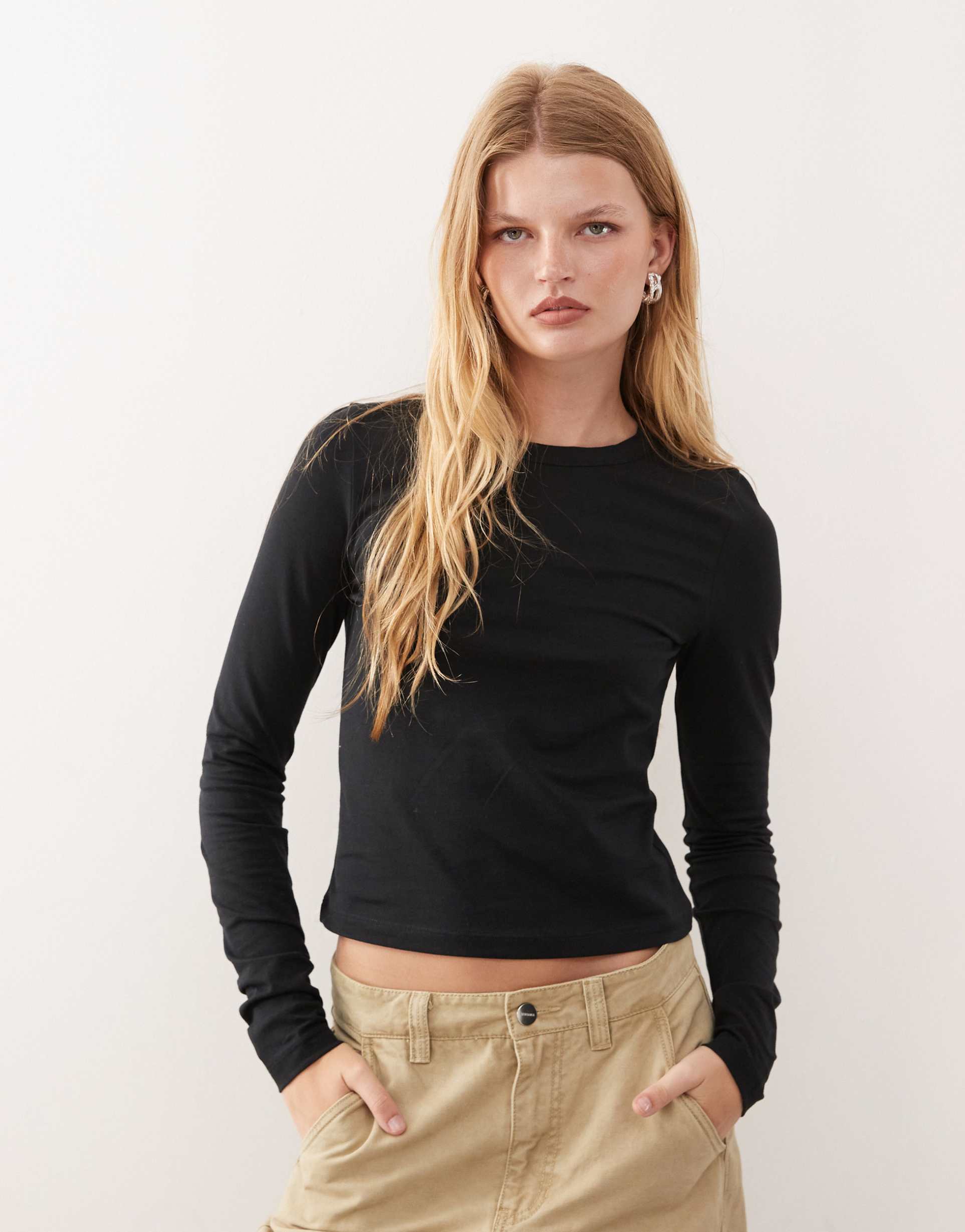 Soft and stretchy cotton-elastane jersey meets a sleek fitted silhouette in this cropped long sleeve t-shirt. Featuring a classic crew neck and regular sleeves, it delivers minimalist appeal with everyday versatility. Perfect for layering or wearing solo, this black essential suits casual outings, workwear looks, and relaxed everyday style with ease.