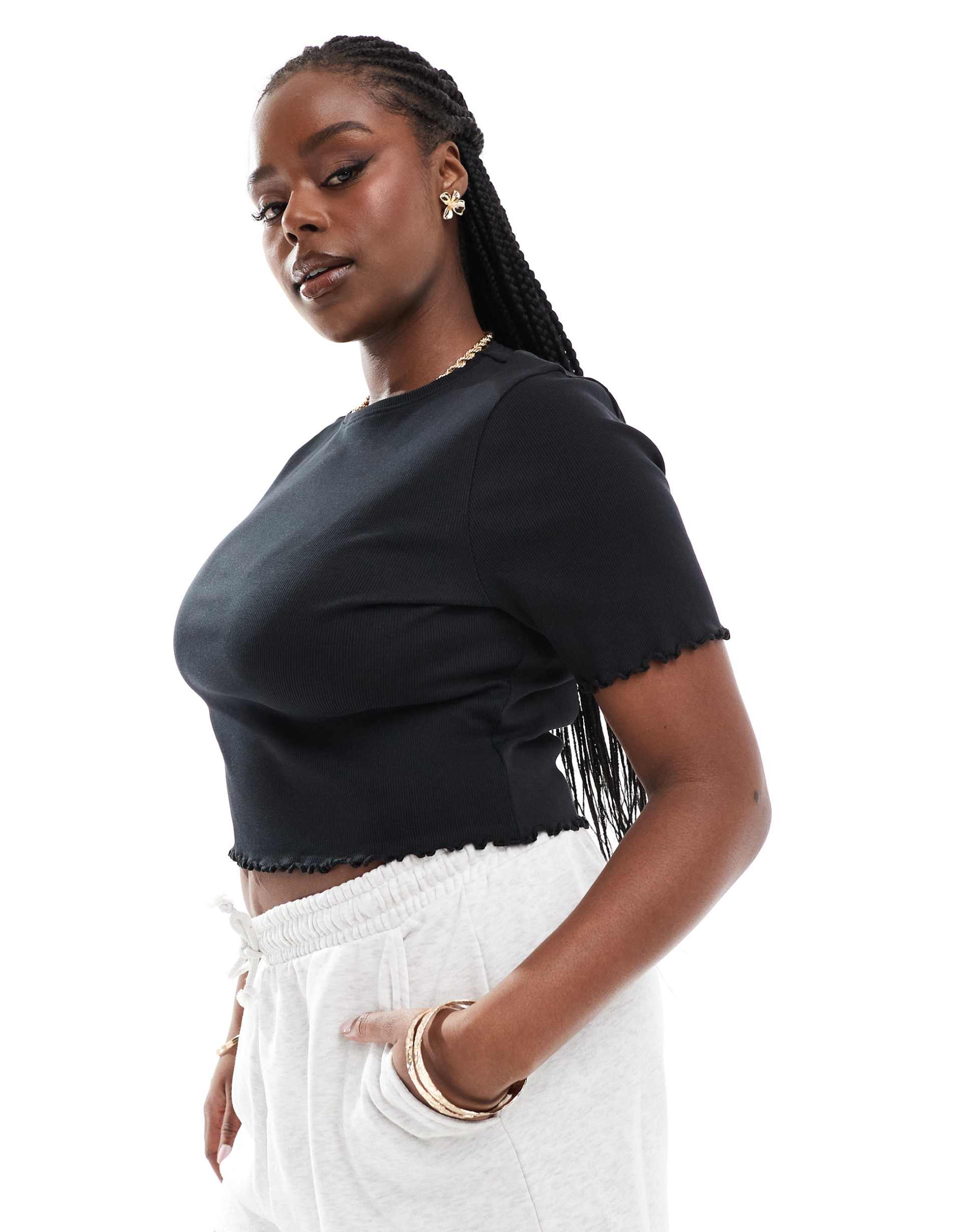 COLLUSION PLUS LETTUCE EDGE RIBBED T-SHIRT IN BLACK
