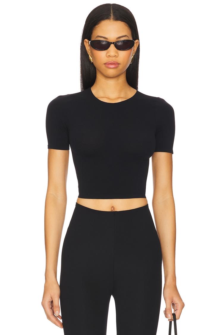 Sleek and streamlined, this black cropped tee features a classic crew neck and half sleeves, crafted from a lightweight nylon-elastane jersey fabric that offers a close, comfortable fit. Its minimalist design and pullover style make it perfect for casual outings, everyday wear, or travel. The covered back and cropped length add modern simplicity to your wardrobe, ensuring effortless pairing with high-waisted bottoms for a chic, understated look.
