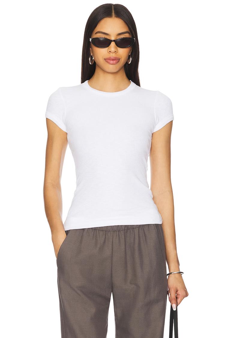 Soft, midweight ribbed jersey fabric crafted from a cotton-elastane blend delivers a fitted, hip-length tunic with classic crew neckline and cap sleeves. This minimalist white top features a pullover style and a semi-sheer texture that adds subtle allure, perfect for casual, everyday wear or travel. Its clean silhouette and breathable fabric make it a versatile staple for layering or standalone styling across all seasons.