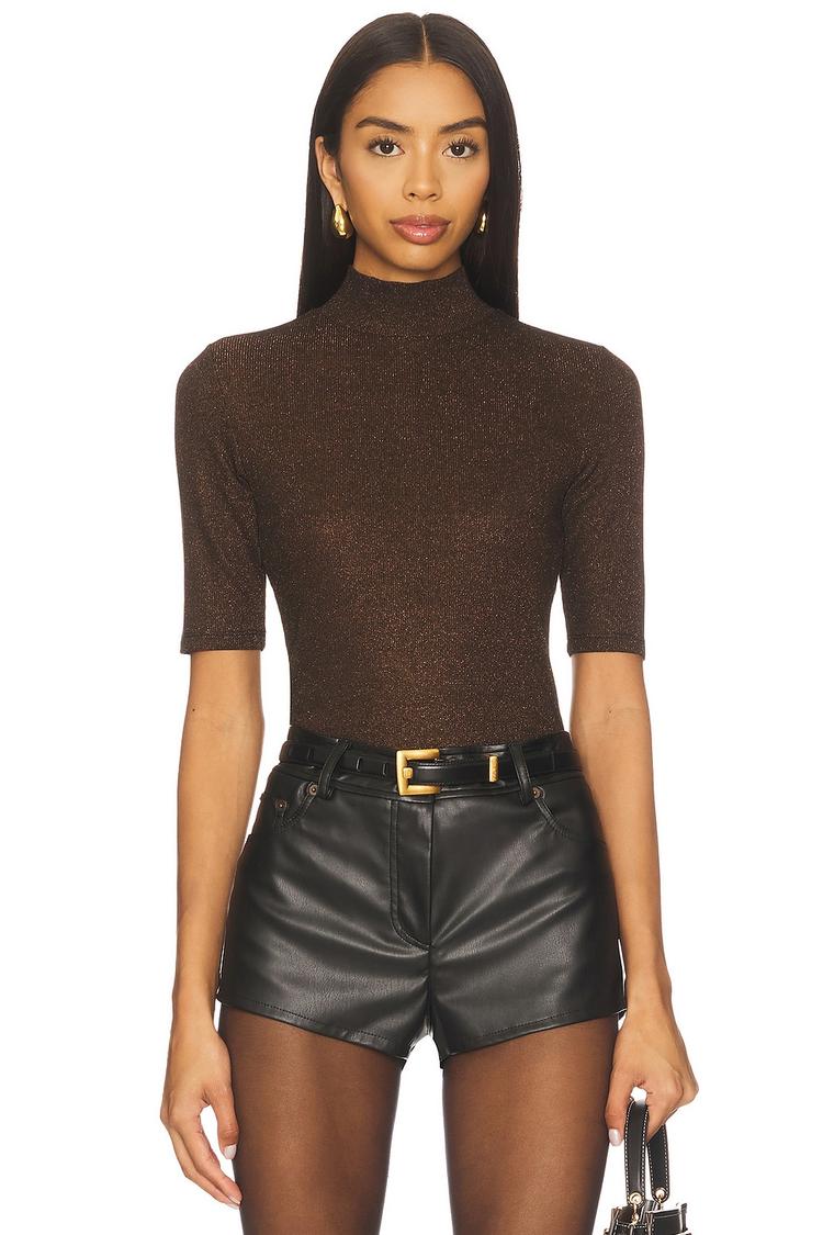 A sleek mock neck and elbow-length sleeves define this slim-fit lurex crew tee, crafted from a lightweight knit jersey with subtle metallic threading. Its semi-sheer, matte dark brown fabric adds a delicate shimmer, making it a versatile layering piece for autumn, winter, or spring. Ideal for casual outings, everyday wear, or night outs, this chic top pairs effortlessly with leather shorts or tailored pants for a refined minimalist style with a modern edge.