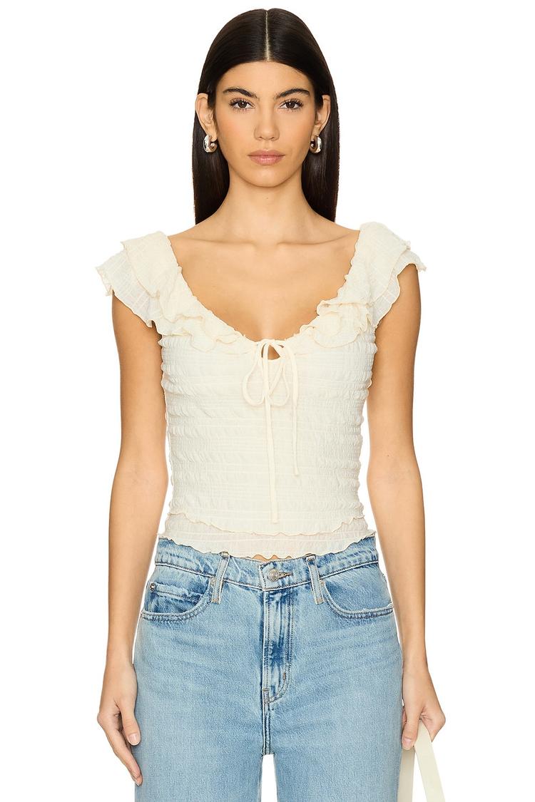 Soft ruffles cascade along the sleeveless cropped silhouette of this fitted tee, crafted from a midweight plisse fabric with a subtle texture. The flattering U-neckline and delicate front tie accent add a romantic touch, making it perfect for casual days, brunch outings, or date nights. Designed for spring and summer wear, this off-white top blends comfort with a feminine charm that pairs effortlessly with denim or skirts for a casual chic look.