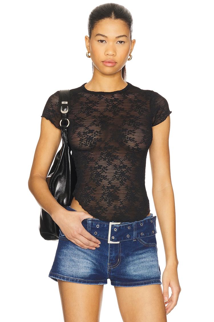 Delicate floral lace in black nylon-spandex blend crafts this fitted shell top featuring a classic crew neckline and half sleeves. Its sheer, hip-length silhouette brings an edgy yet sexy vibe perfect for casual days, streetwear looks, or a night out. The slip-on style ensures comfort while the all-over lace pattern adds texture and visual intrigue. Ideal for spring and summer, this lace tee pairs effortlessly with denim for a trendy, confident ensemble.