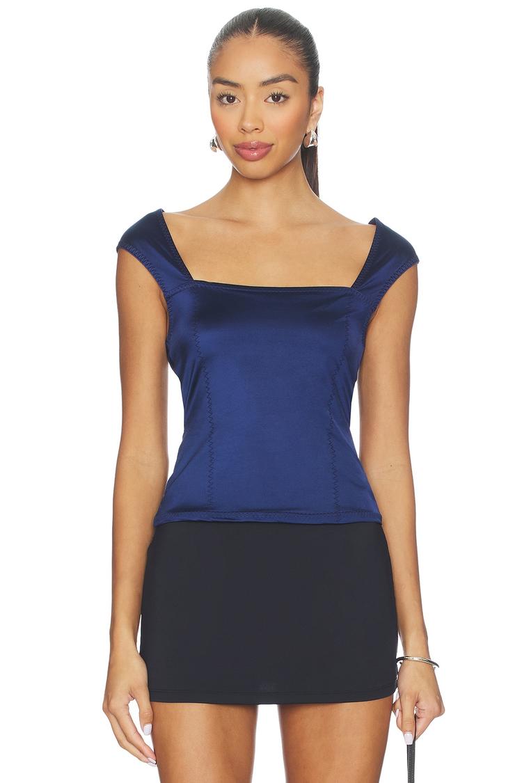 Matte dark blue jersey fabric forms a fitted shell top with wide straps and a distinctive square neckline. The sleeveless silhouette and waist-length cut exude modern sophistication, while the open back with a bold cutout design adds a sexy, contemporary edge. Ideal for spring and summer, this versatile piece is perfect for casual outings, night outs, or date nights, combining comfort with a chic statement style.