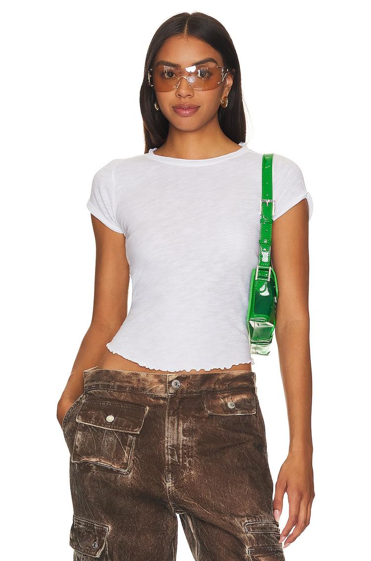 Lightweight cotton jersey and a fitted silhouette define this shell top featuring a classic crew neck and half sleeves with cuffed styling. The subtle ruffled lettuce hem adds a delicate design detail that enhances its minimalist, casual chic vibe. Semi-sheer fabric lends an airy feel, perfect for spring and summer days. Ideal for casual outings, everyday wear, or brunch dates, this waist-length tee blends comfort and style effortlessly for versatile seasonal wear.