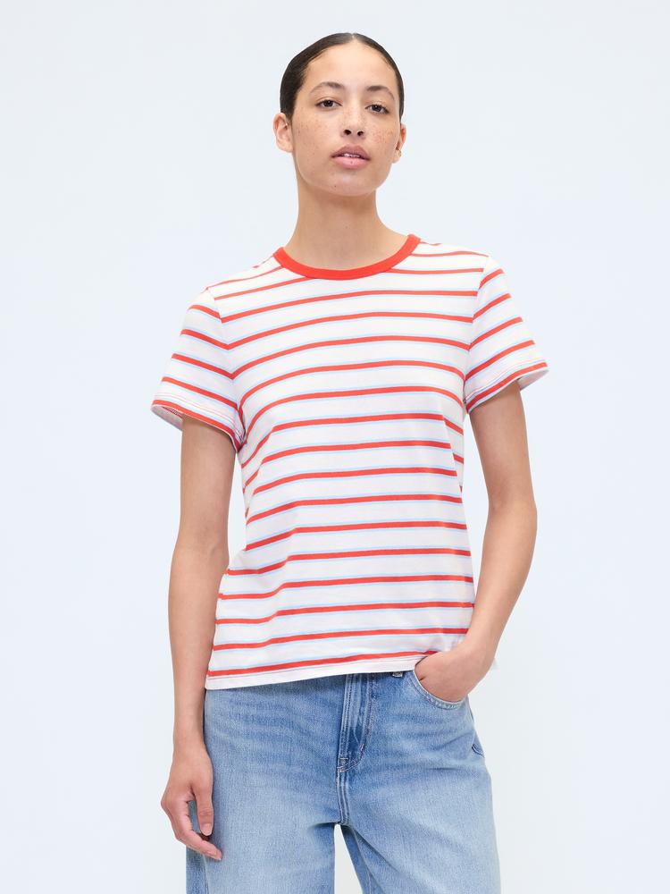 Elevate your everyday style with our Favorite Stripe Crewneck T-Shirt! Crafted from soft cotton jersey, this casual tee features a classic crew neck and comfortable short sleeves. Adorned with playful red and white stripes that effortlessly enhance any outfit, this top is perfect for sunny days out or relaxed weekends. Pair it with your favorite jeans or shorts for a chic yet laid-back look. A versatile staple that brings a pop of color to your wardrobe, it's a must-have for the spring and summer seasons.