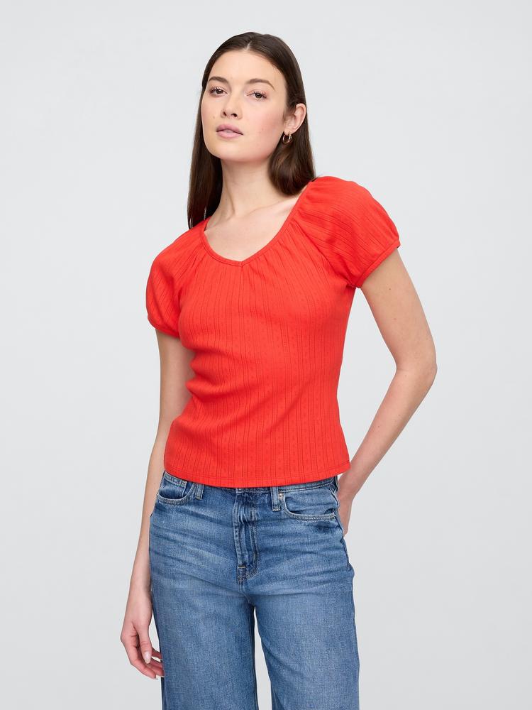 Brighten up your wardrobe with our Pointelle Puff Sleeve Top, a cheerful staple perfect for any casual outing. Crafted from soft cotton, this fitted top features enchanting puffed sleeves that add a playful touch, alongside a flattering V-neckline. Ideal for brunches with friends or cozy date nights, it pairs beautifully with jeans or skirts for endless styling possibilities. Make a bold statement this season with this vibrant red piece that embodies versatility and femininity.