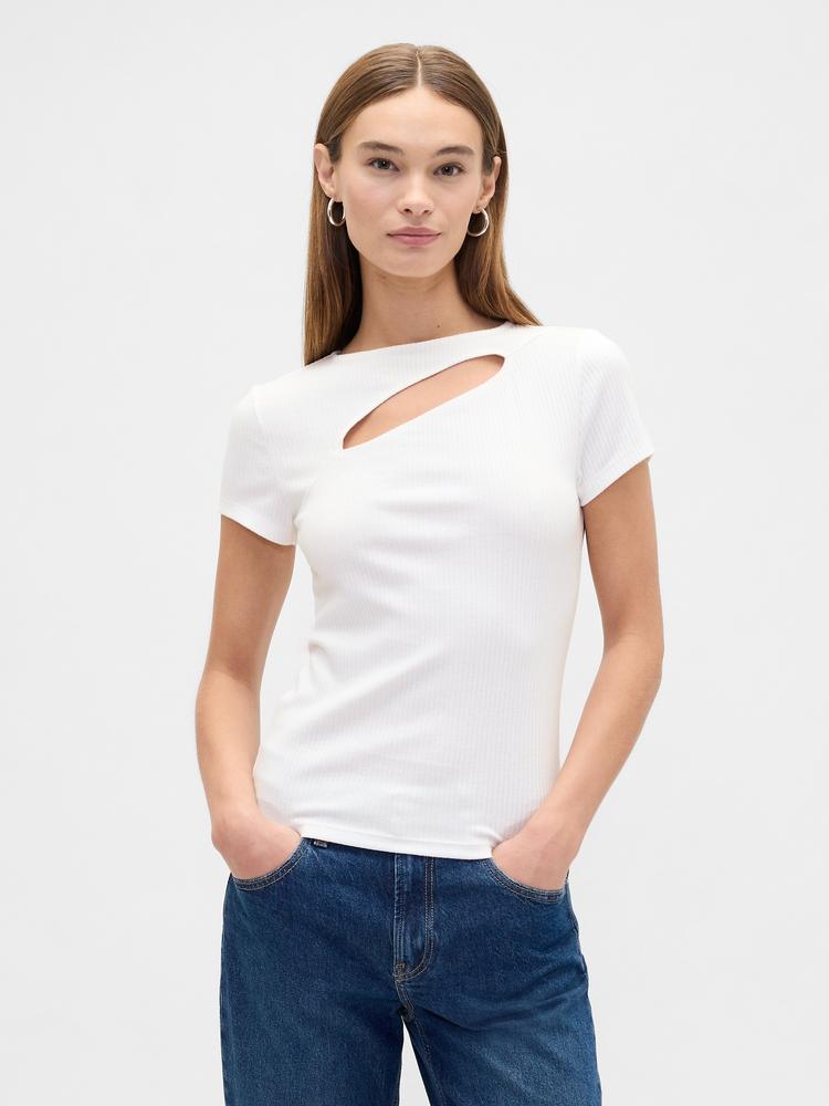 Soft ribbed cotton fabric and a regular fit define this hip-length shell top, featuring a classic crew neck and short regular sleeves for everyday comfort. The standout front cutout detail adds a modern twist to its minimalist design, making it a versatile choice for casual outings, brunch dates, or relaxed weekend wear. Its covered back and slip-on closure enhance the ease of wear, while the crisp white shade complements a variety of looks effortlessly.