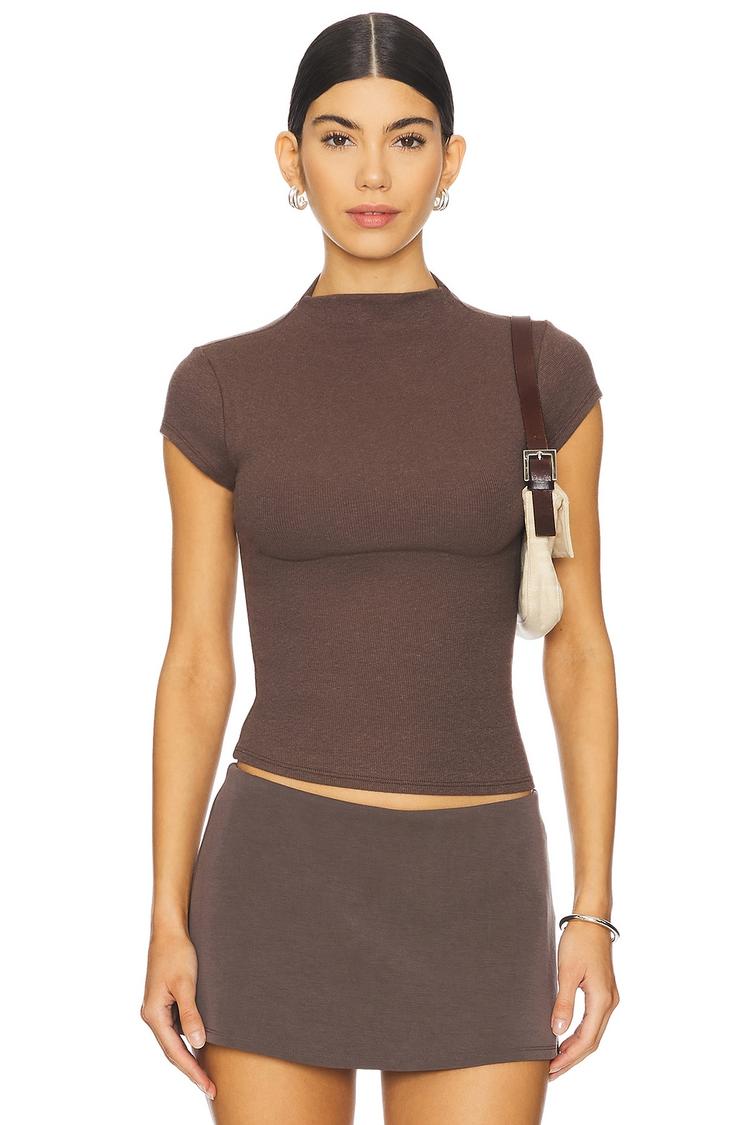 This cropped, fitted tee features a sleek mock neck and cap sleeves crafted from a lightweight rib knit blend of cotton and spandex. Its matte brown hue offers a minimalist, modern appeal ideal for casual outings, everyday wear, or brunch dates. The pullover style and covered back provide a clean, streamlined silhouette, making it a versatile essential for all seasons. Pair it effortlessly with skirts or high-waisted pants for a chic, understated look.
