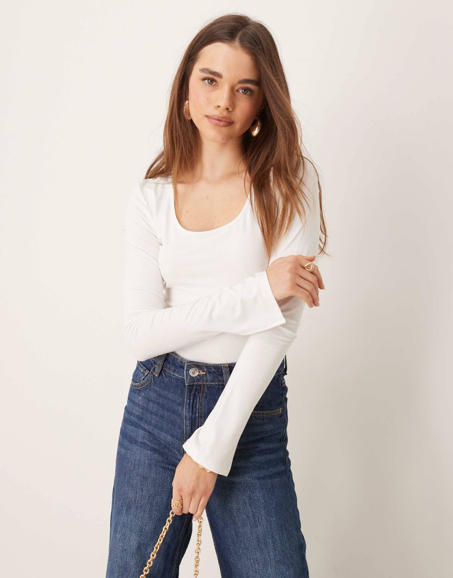 GINA TRICOT SOFT TOUCH LONG SLEEVE TOP WITH SCOOP NECK AND SPLIT CUFFS IN OFF WHITE