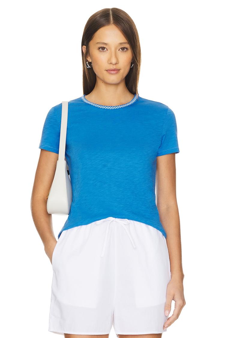 Bright blue cotton jersey with slub texture and a classic fit brings effortless style to your wardrobe. This classic tee features a round neck adorned with delicate white embroidered trim, adding a subtle decorative touch at the collar. Half sleeves and a hip-length hem make it versatile and comfortable for spring, summer, and autumn days. Ideal for casual outings, everyday wear, and business casual looks, this pullover tee pairs easily with shorts or skirts, combining timeless simplicity with refined details for a polished yet relaxed vibe.