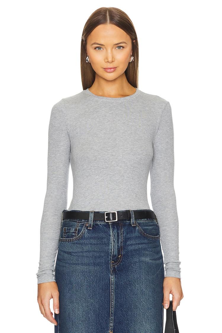 Soft ribbed modal fabric and a fitted silhouette define this gray long sleeve tee, featuring a classic crew neck and regular sleeves for everyday ease. Its hip length and pullover style make it a versatile layering piece perfect for casual outings, workwear, and travel. The minimalist design lends a clean, timeless appeal that blends seamlessly with both relaxed and business casual looks, offering comfort and style year-round.