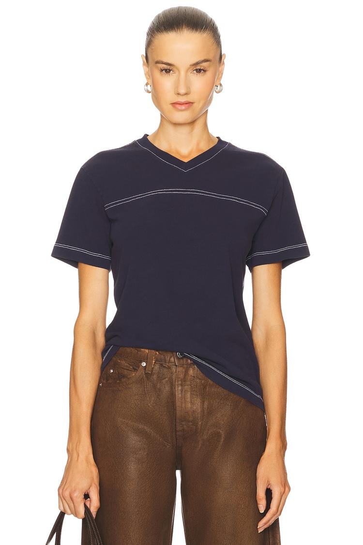 Crafted from 100% cotton midweight jersey, this matte dark blue football tee features a classic ribbed V-neck and contrast stitching that adds subtle detail. Its regular fit, half sleeves, and hip-length tunic style make it an effortlessly versatile piece for casual days, streetwear looks, or everyday wear. The pullover design and covered back enhance comfort and ease, while the minimalist aesthetic ensures it pairs well with various bottoms for a laid-back yet polished vibe.
