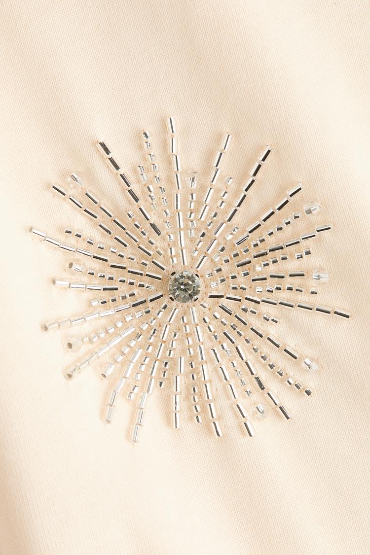 Soft cream cotton with a loose, boxy fit and half sleeves creates an effortlessly chic look. The classic crew neckline and waist-length hem ensure versatile styling, while the front embellished bead and rhinestone detailing adds a subtle touch of sparkle. Ideal for casual outings, everyday wear, or relaxed brunches, this embellished T-shirt combines comfort with understated glamour, perfect for spring through autumn wardrobes.