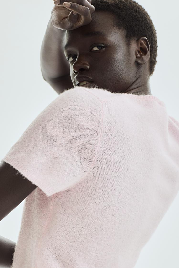 Softly textured in a fine wool knit, this light pink shell top features a classic round neck and half sleeves for a versatile hip-length fit. Its minimalist silhouette is designed for everyday ease, making it perfect for casual outings, workwear, or relaxed brunches. The pullover style and regular fit ensure comfort without compromising style, presenting a refined yet simple option to layer or wear solo in transitional seasons like spring and autumn.