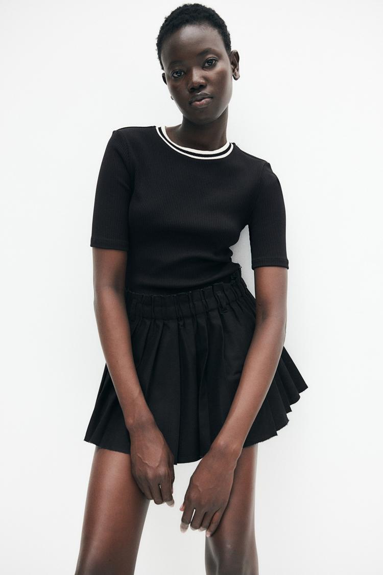 Crisp matte black knit fabric and a fitted silhouette define this classic T-shirt. Featuring a timeless crew neck with contrasting white double stripes, this half-sleeve tee hits at hip length for versatile layering or standalone wear. Its minimalist design and comfortable fit make it ideal for everyday casual outings, workwear, or relaxed weekends. The subtle ribbed texture adds a refined touch while maintaining effortless style.