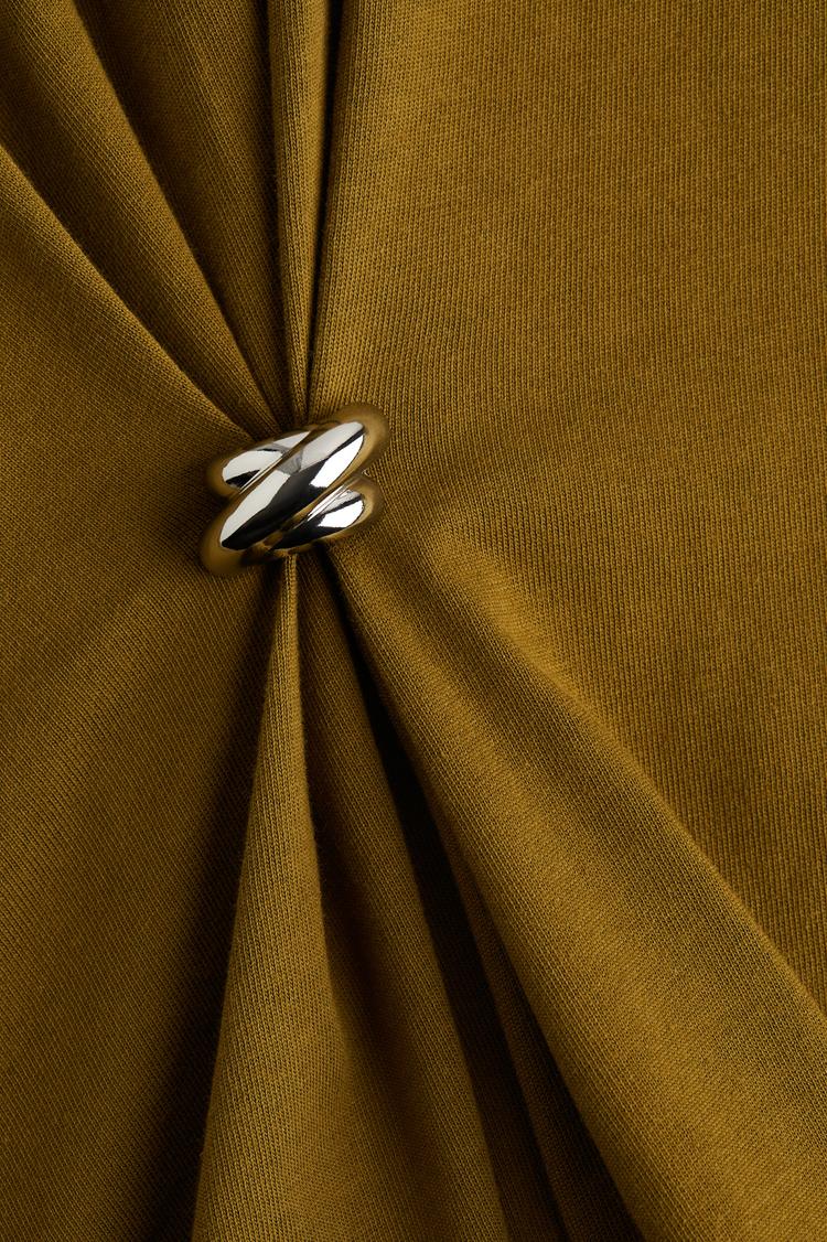 A matte olive loose-fit boxy T-shirt crafted in soft cotton offers casual chic appeal with half sleeves and a classic crew neck. The hip-length silhouette is enhanced by a distinctive metallic detail at the front, adding modern edge to minimalist styling. Versatile for everyday wear, this pullover piece transitions seamlessly from spring through autumn, perfect for casual outings, relaxed weekends, or laid-back brunches.