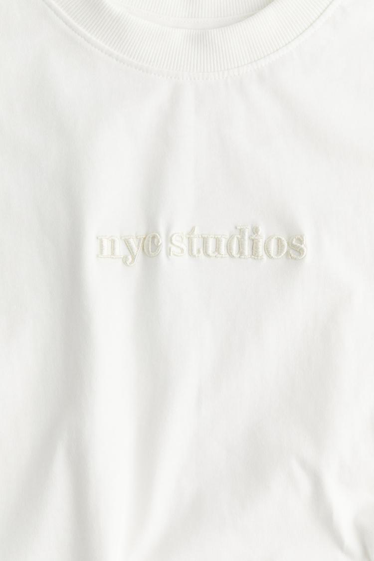 A relaxed and oversized fit combines with soft cotton fabric to create this minimalist white T-shirt, featuring subtle embroidered logo detailing on the front. The classic crew neckline and regular sleeves add to its casual chic vibe, making it an ideal choice for everyday wear, casual outings, and travel days. Its understated design and breathable material provide versatile comfort for all weather seasons.