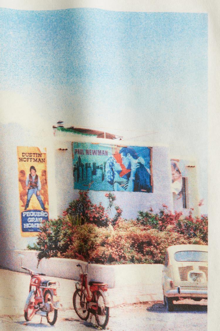 Soft cotton fabric and an oversized fit create a relaxed silhouette for casual ease. This hip-length t-shirt features a classic crew neckline and half sleeves, complemented by a vibrant photographic print on the front showcasing a vintage outdoor scene. Its off-white base color pairs effortlessly with a variety of bottoms, making it ideal for everyday wear, street style looks, or casual outings during spring, summer, and autumn.
