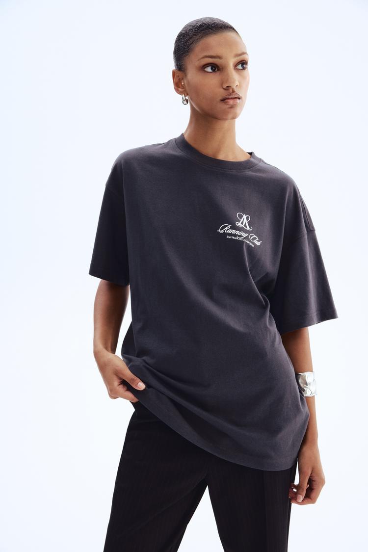 Matte black cotton and an oversized fit create a laid-back vibe in this hip-length t-shirt. Featuring a classic crew neck and half sleeves, its minimalist design is elevated by a small white front print detail. The covered back and pullover style add to its ease of wear, making it a versatile piece for casual, everyday, and streetwear looks. Pair it effortlessly with jeans or trousers for a relaxed yet chic aesthetic perfect for all seasons.