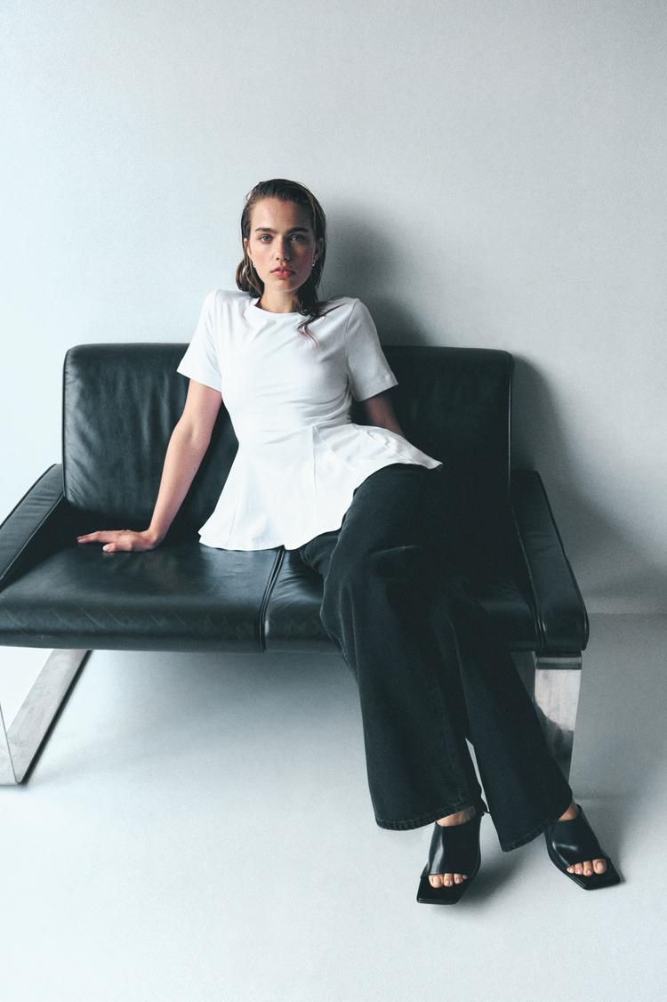 Soft cotton fabric and a fitted silhouette highlight this minimalist white peplum top. Its classic crew neck and half sleeves offer everyday comfort, while the flared peplum hem adds a subtle feminine flair. Ideal for casual outings, brunch dates, or relaxed everyday wear, this hip-length tee pairs effortlessly with jeans or tailored pants for a chic casual look.