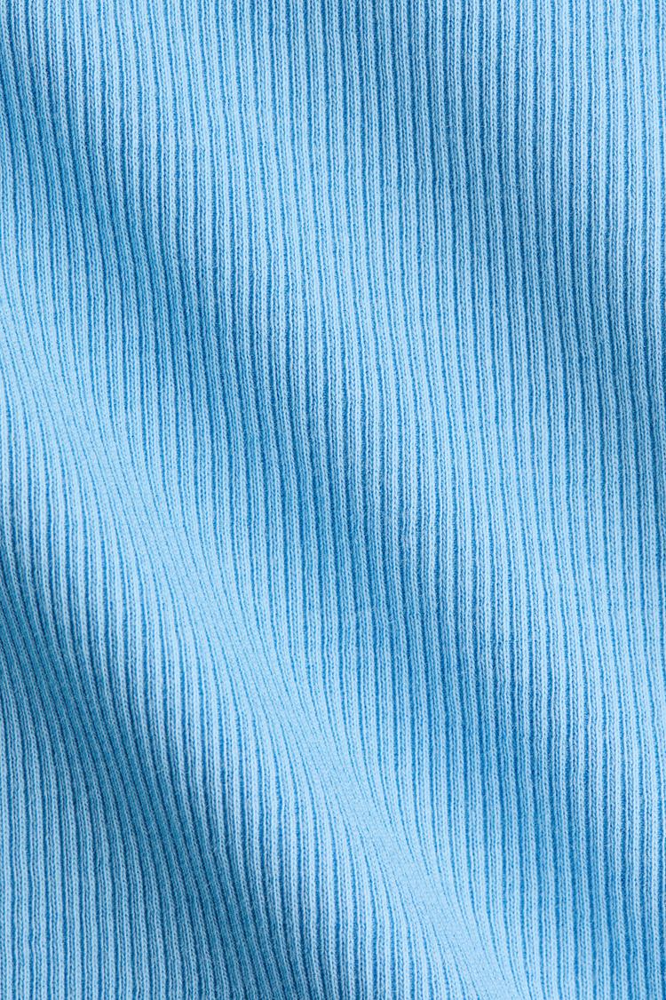 A fitted rib knit T-shirt in a refreshing matte light blue hue offers a clean crew neckline and classic half sleeves for a timeless look. The waist-length silhouette and minimalist design make it a versatile piece ideal for casual outings, everyday wear, or brunch dates. Crafted in a soft ribbed fabric, this T-shirt pairs effortlessly with denim shorts or jeans, combining comfort with a sleek, casual chic vibe perfect for spring and summer seasons.