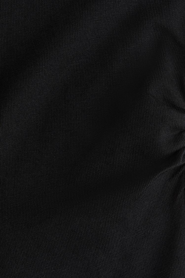 A matte black cotton tee featuring a slim fit and classic crew neck design. This half-sleeve top offers subtle front ruching that enhances shape without overpowering its minimalist appeal. With a hip-length hem and pullover style, it’s an effortlessly chic piece ideal for everyday wear, casual outings, and streetwear looks throughout the year.