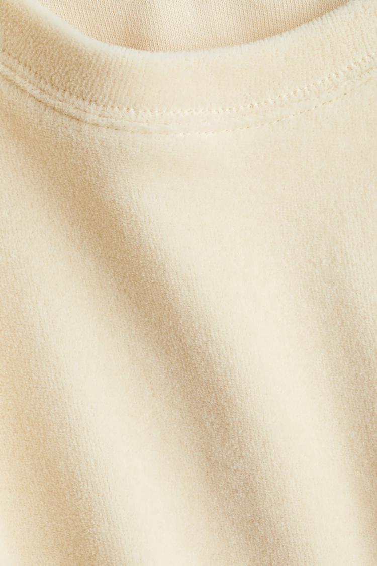 Soft matte beige velour fabric defines this relaxed fit tunic, perfect for casual days and lounging in comfort. Featuring a classic crew neck and regular short sleeves, its hip-length silhouette offers effortless style and versatility. Ideal for travel, everyday wear, or laid-back weekends, this minimalist tunic exudes casual chic appeal with a covered back and pullover closure, making it a cozy staple for all-weather wear.