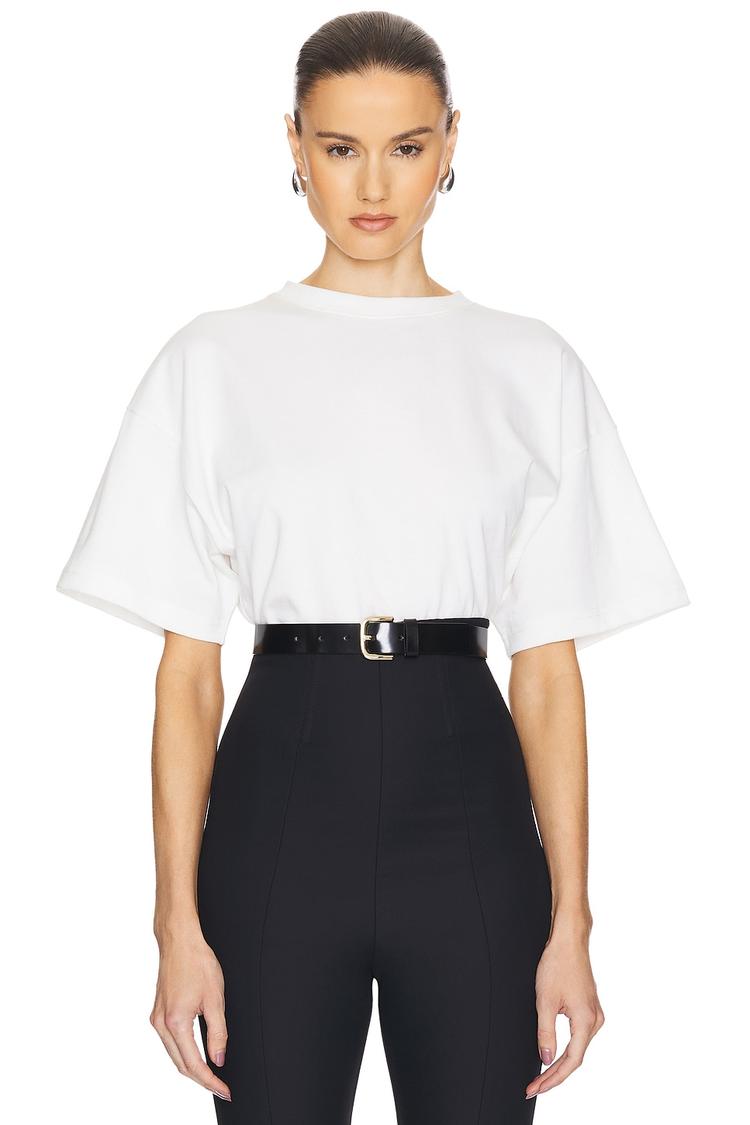 Crisp white cotton crafted in a thick jersey knit brings structure and comfort to this boxy, waist-length tee. Featuring a classic crew neck and half sleeves with a sculpted hem that adds subtle draping detail, this versatile piece pairs effortlessly with high-waisted bottoms. Its minimalist and modern silhouette suits casual days, brunch meetups, or business casual settings, offering a fresh and clean aesthetic. Machine washable and made in the USA, this sculpted tee is a timeless essential designed for all seasons and everyday wear.