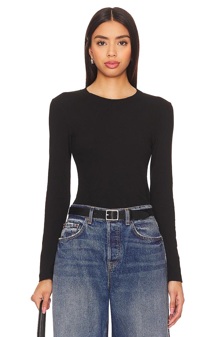 Crisp matte black jersey fabric defines this fitted long sleeve tee with a classic crew neckline and waist length hem. Designed for everyday ease and versatility, it pairs seamlessly with casual denim or layers under blazers for workwear and travel. The inclusion of cotton and polyurethane offers comfort with a slight stretch, enhancing fit and movement. Minimalist and timeless, this wardrobe staple suits multiple seasons and occasions while providing a sleek silhouette and clean lines.