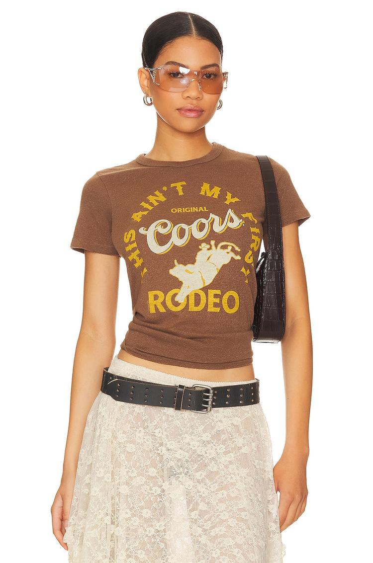 Rich matte brown jersey fabric complements the slim fit and classic crew neck design of this tank top. Featuring half sleeves and hip length hem, it offers casual chic appeal with a bold yellow and white graphic print on the front. Perfect for spring and summer days, this pullover top suits street style, everyday wear, and casual outings with ease, combining comfort and style effortlessly.