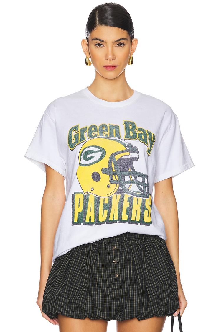 Relaxed and iconic, this white cotton jersey tee features a classic crew neck and half sleeves for easy wear. The loose fit and hip-length silhouette make it a comfortable choice for casual days, while the bold Green Bay Packers graphic on the front adds sporty flair. Crafted from breathable cotton fabric, it’s perfect for spring through autumn. Ideal for casual outings, street style looks, or cheering on game day, this pullover tee pairs effortlessly with your favorite jeans or skirts for versatile everyday style.