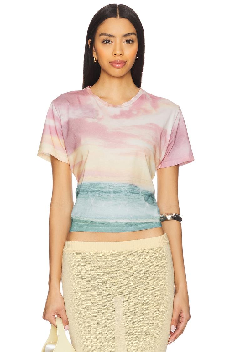 Soft jersey fabric in a matte pink base with abstract sunset-inspired stripes in yellow and blue creates a relaxed, casual chic shell top. Featuring a classic round neck and half-length regular sleeves, this waist-length tee offers a regular fit for everyday ease. Its pullover style and covered back add to the minimalist modern vibe. Ideal for spring and summer, this versatile tee works perfectly for casual outings, brunch, travel, and streetwear occasions.