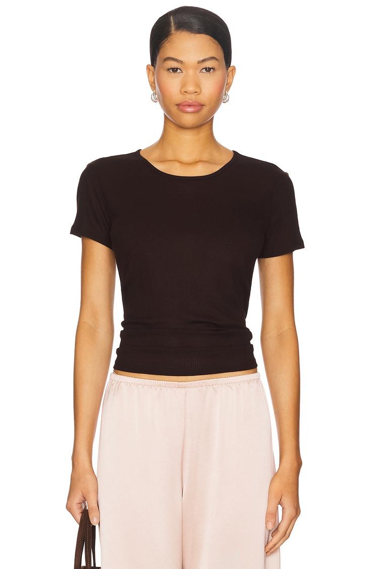 A sleek silhouette in matte black, this classic tee features a round neck and half sleeves crafted from lightweight ribbed viscose jersey. Its fitted waist-length design offers a flattering, minimalist look perfect for casual outings, everyday wear, and travel. The covered back and pullover closure keep the style simple and versatile, making it a reliable staple for workwear or relaxed weekends. Soft and breathable, this top blends comfort with timeless elegance for a quiet luxury feel.