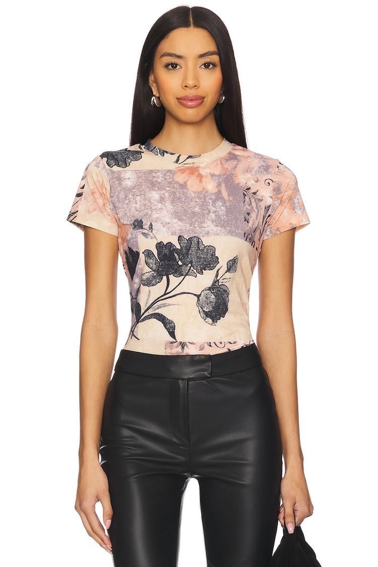 Soft stretch jersey fabric shapes this fitted tunic with a classic crew neck and half sleeves, delivering a sleek silhouette in matte beige. The all-over floral and abstract print in dusty rose, pale purple, and black adds a modern minimalist vibe. Its hip length and comfortable fit make it ideal for casual outings, brunch dates, and everyday wear across spring and summer seasons. Effortlessly chic and versatile, this nylon-elastane blend tee combines breathable comfort with contemporary style for a refined casual chic look.