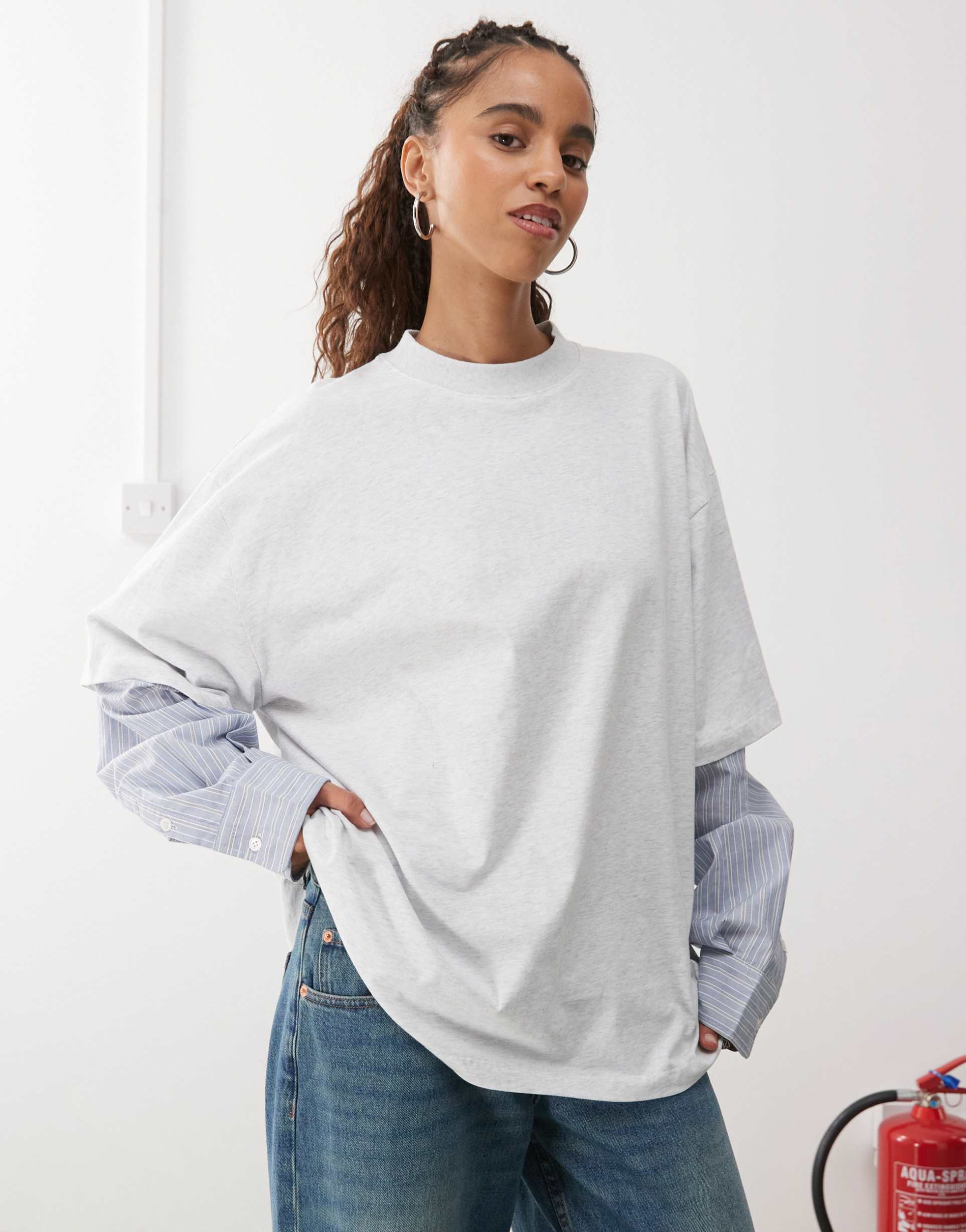 LIONESS 2 IN 1 OVERSIZED T-SHIRT AND STRIPED LONG SLEEVE SHIRT OVERLAY TOP IN GRAY AND BLUE STRIPES
