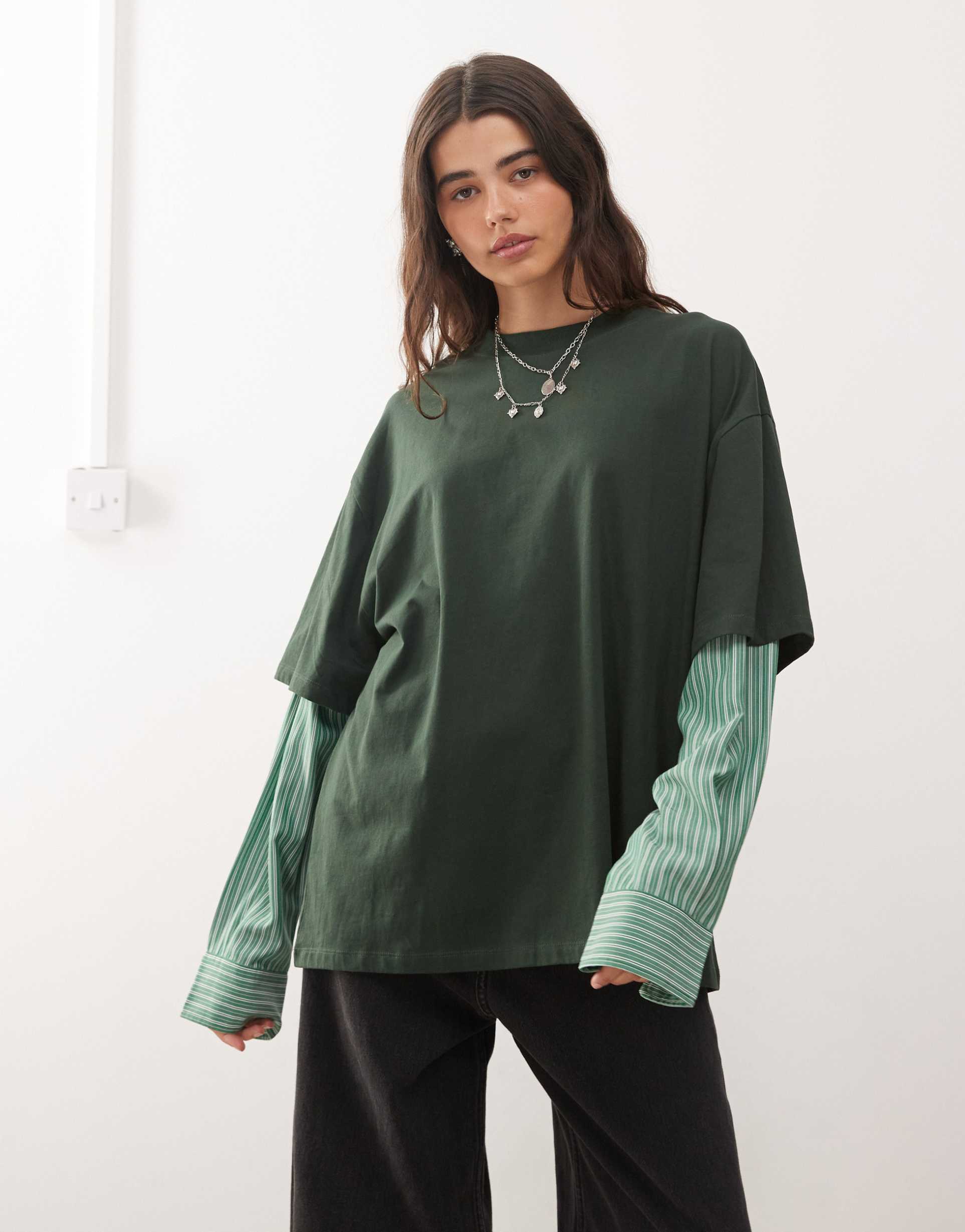 LIONESS 2 IN 1 OVERSIZED T-SHIRT OVERLAY LONG SLEEVE SHIRT IN DARK GREEN AND GREEN STRIPES