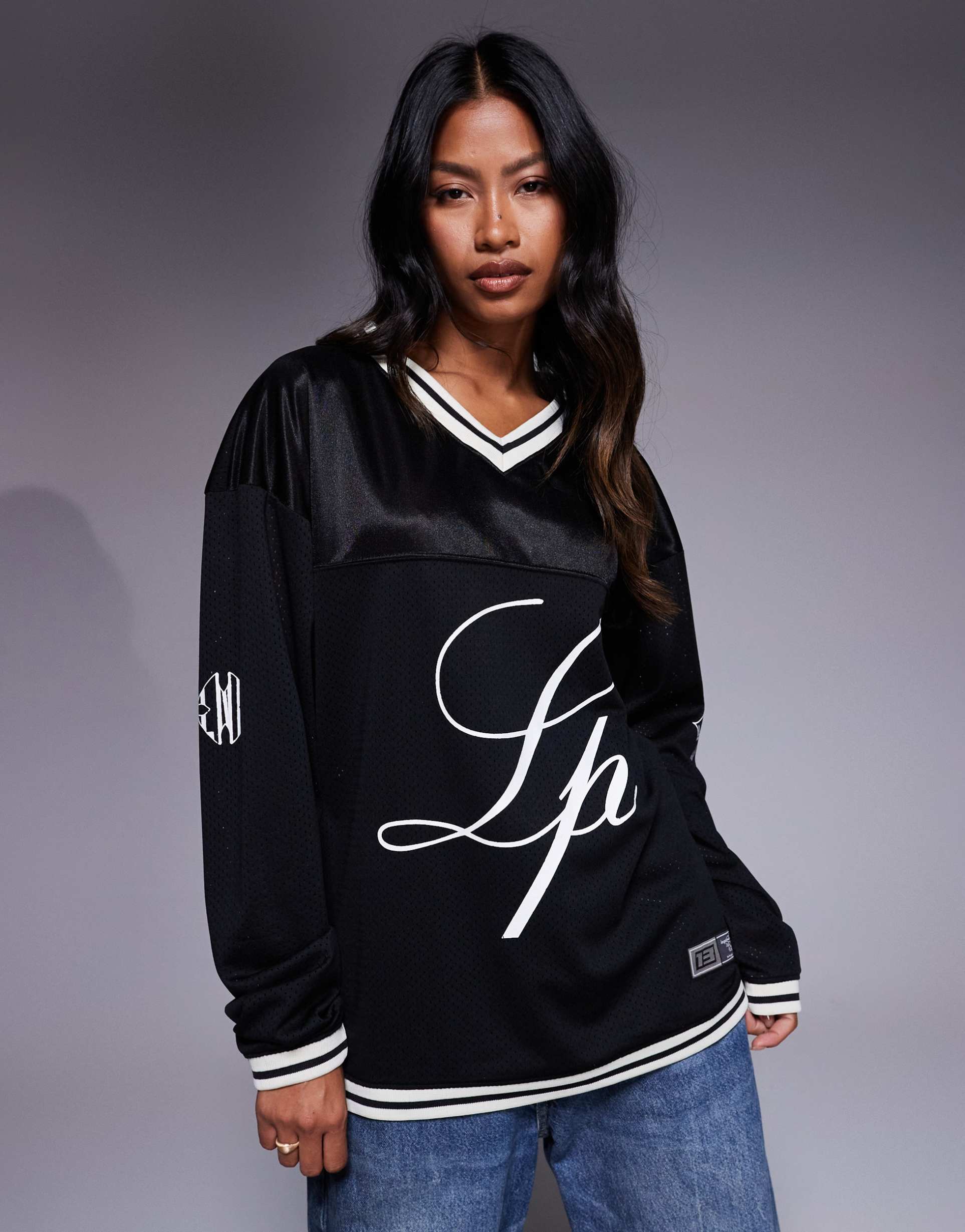 Bold and versatile, this Liquor N Poker varsity-style top features a relaxed fit with a classic V-neck and long sleeves. Crafted from smooth polyester, it offers comfortable wear with drop shoulders and ribbed trim at cuffs and hem. The matte black base is contrasted by striking white Rebel 13 logo text on the front and additional prints on the back and sleeves, making it a standout street style piece. Ideal for casual outings, streetwear looks, and everyday wear, this hip-length pullover blends sporty attitude with effortless comfort.
