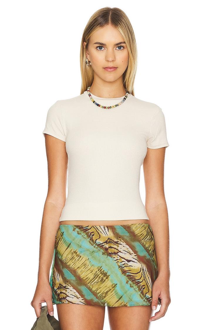 Soft ribbed rayon blended fabric and a fitted silhouette highlight this cream shell with a classic crew neck and half sleeves. Its waist length and minimalist style make it an essential piece for casual outings, workwear, or business casual events. The subtle texture adds a cozy yet polished feel, perfect for spring through autumn seasons. Pair it with skirts or trousers for effortless brunches, everyday wear, or relaxed office days.
