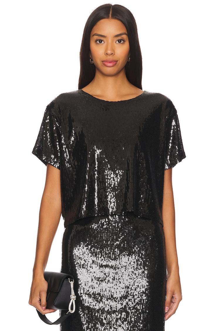 Shimmering sequins cover this boxy silhouette T-shirt in sleek black polyester with elastane stretch, creating a chic and trendy look perfect for night outs, cocktail parties, and festive events. The hip-length cut and half sleeves with a classic round neckline offer a balanced, comfortable fit while the covered back and subtle back vent add ease and style. This pullover piece combines party-ready sparkle with relaxed wearability, making it a versatile choice for elevating your evening wardrobe with a polished yet effortless vibe.