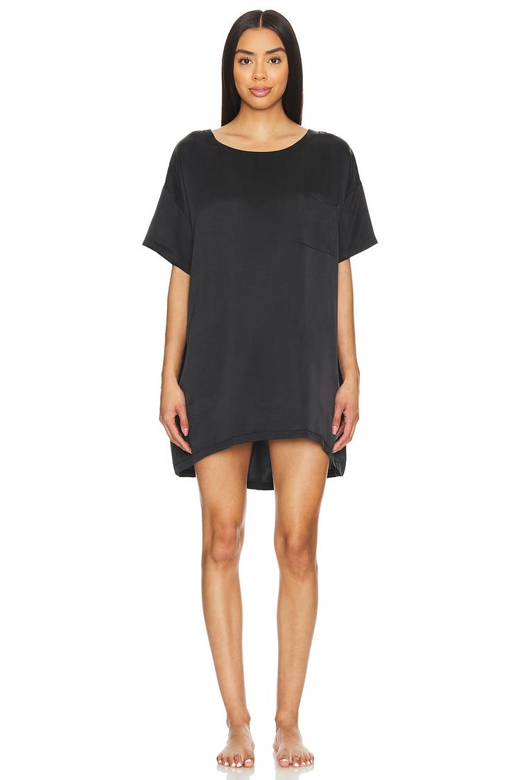 Soft matte black silk charmeuse forms this oversized tunic tee, designed for ultimate comfort with a relaxed fit and mini length perfect for lounging or sleepwear. Featuring a round neck and half sleeves, it offers easy slip-on styling and a discreet breast slip pocket for subtle detail. Its minimalist design and lightweight fabric make it ideal for casual days at home, restful nights, or low-key weekends. The clean hemline and smooth silhouette add to its understated elegance and versatile appeal.