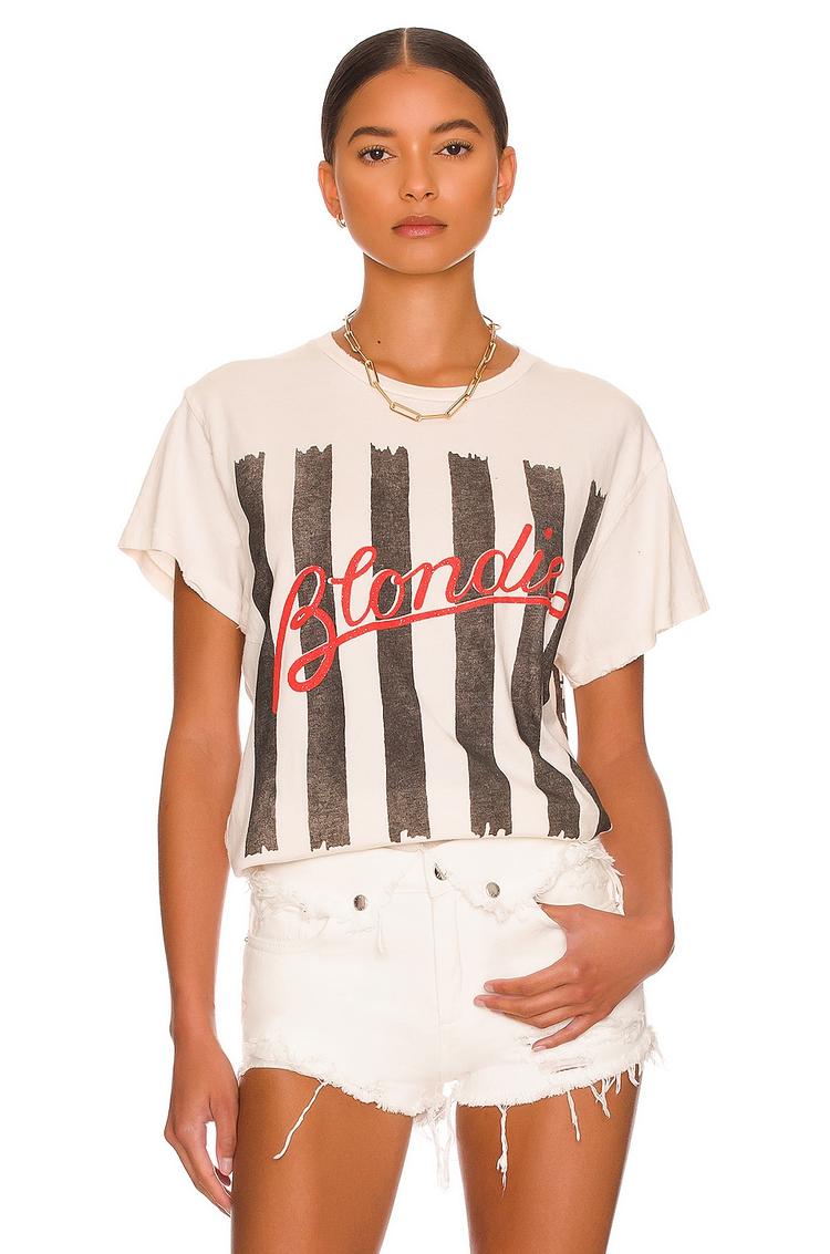 Soft jersey cotton and a loose fit define this vintage-inspired shell top featuring bold black vertical stripes and a striking red 'Blondie' logo on front and back. With a classic crew neck and short regular sleeves, its hip-length silhouette and intentionally destroyed trim bring a relaxed, edgy vibe perfect for casual outings, street style, and weekend brunches. This breathable and comfortable tee embodies retro street chic while delivering everyday versatility for warmer seasons.