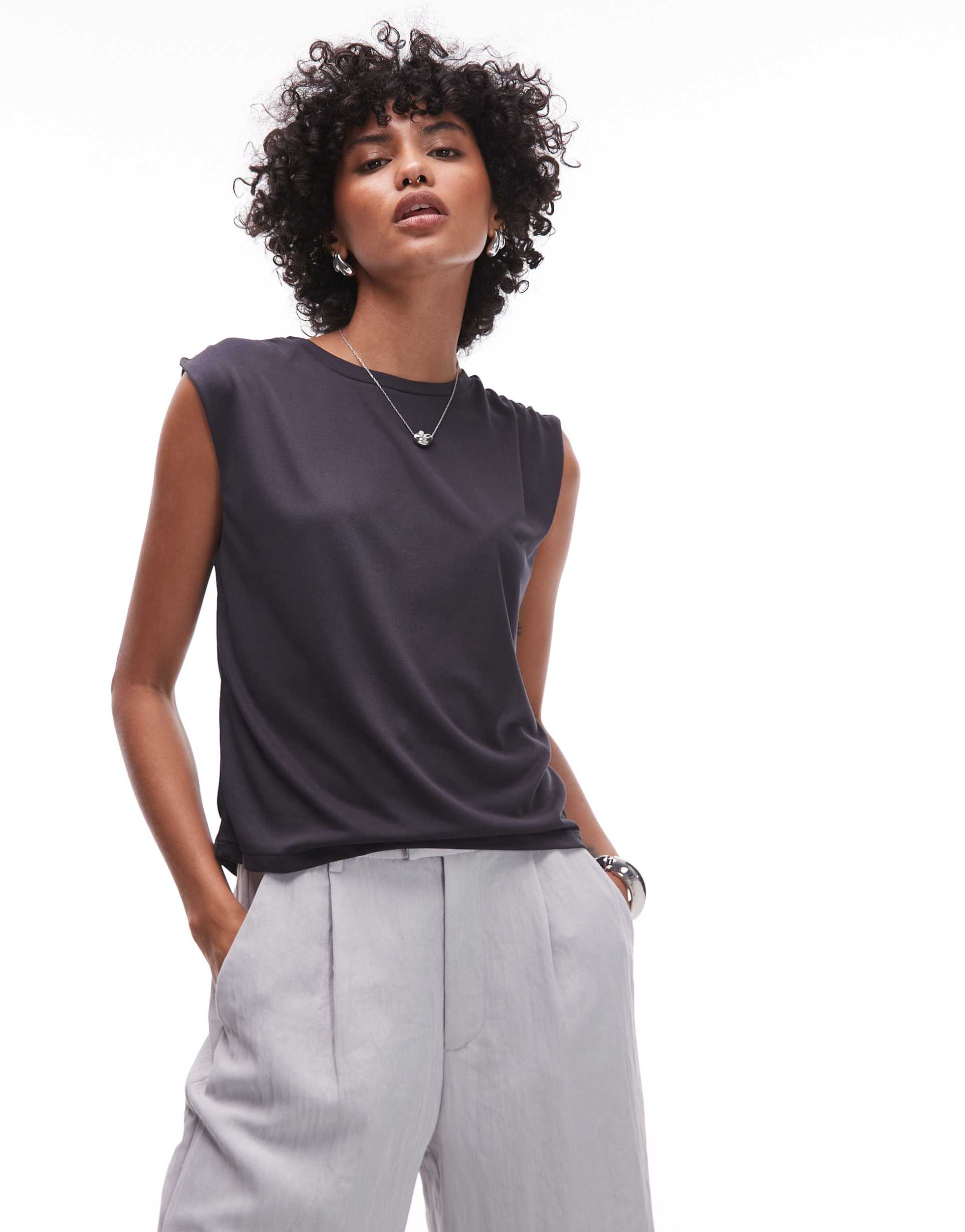 Soft viscose-polyester jersey fabric meets a regular fit in this sleeveless tank top, featuring a classic crew neck and subtle ruching at the shoulders for a refined twist. The matte charcoal hue adds a versatile, minimalist touch, making it ideal for casual, everyday wear or elevated workwear looks. Its hip length and pullover style ensure comfortable ease throughout the day, while the ruched shoulder detail lends just the right amount of visual interest for brunch or casual meetings.