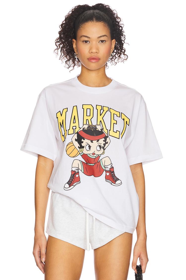 Feel-good casual with a playful twist. This Market Betty Boop Dunking T‑shirt is crafted in 100% cotton with a midweight jersey feel, offering breathable comfort and everyday ease. The relaxed, boxy silhouette, classic crew neck and regular short sleeves give it a laid-back, oversized vibe that pairs effortlessly with denim, bike shorts, or lounge bottoms. A bold front graphic—Betty Boop in red and yellow with black detailing—adds a fun, graphic focal point to your off-duty look. Versatile for weekends, casual outings, or streetwear days, it’s an effortless staple that elevates simple tees into cult-favorite casual wear.