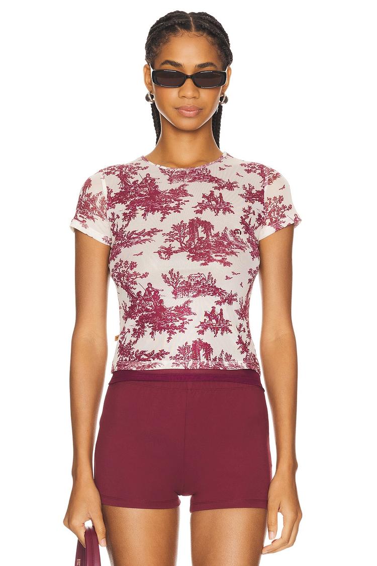 Lightweight mesh fabric and a fitted silhouette define this tunic with a crew neckline and half sleeves, designed in a semi-sheer cream base with all-over burgundy floral print. Its waist-length cut makes it a versatile piece for casual wear, ideal for streetwear, everyday outings, or relaxed summer occasions. The pullover style ensures easy wear, while the mesh material adds a subtle hint of transparency for a modern, minimalist look with a casual chic vibe.
