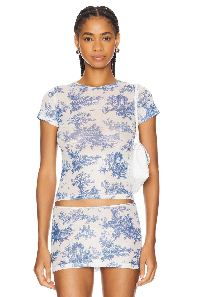 Lightweight mesh fabric and a slim fit define this cropped mini tee, featuring a delicate all-over blue floral print on a soft off-white base. The half sleeves and classic crew neckline create a balanced silhouette that's perfect for warmer days. Its sheer design adds a trendy, modern edge, making it an ideal pick for casual outings, brunch dates, or night outs. Pull-on styling ensures easy wear while maintaining a sleek look that pairs effortlessly with high-waisted skirts or shorts for a chic street style vibe.